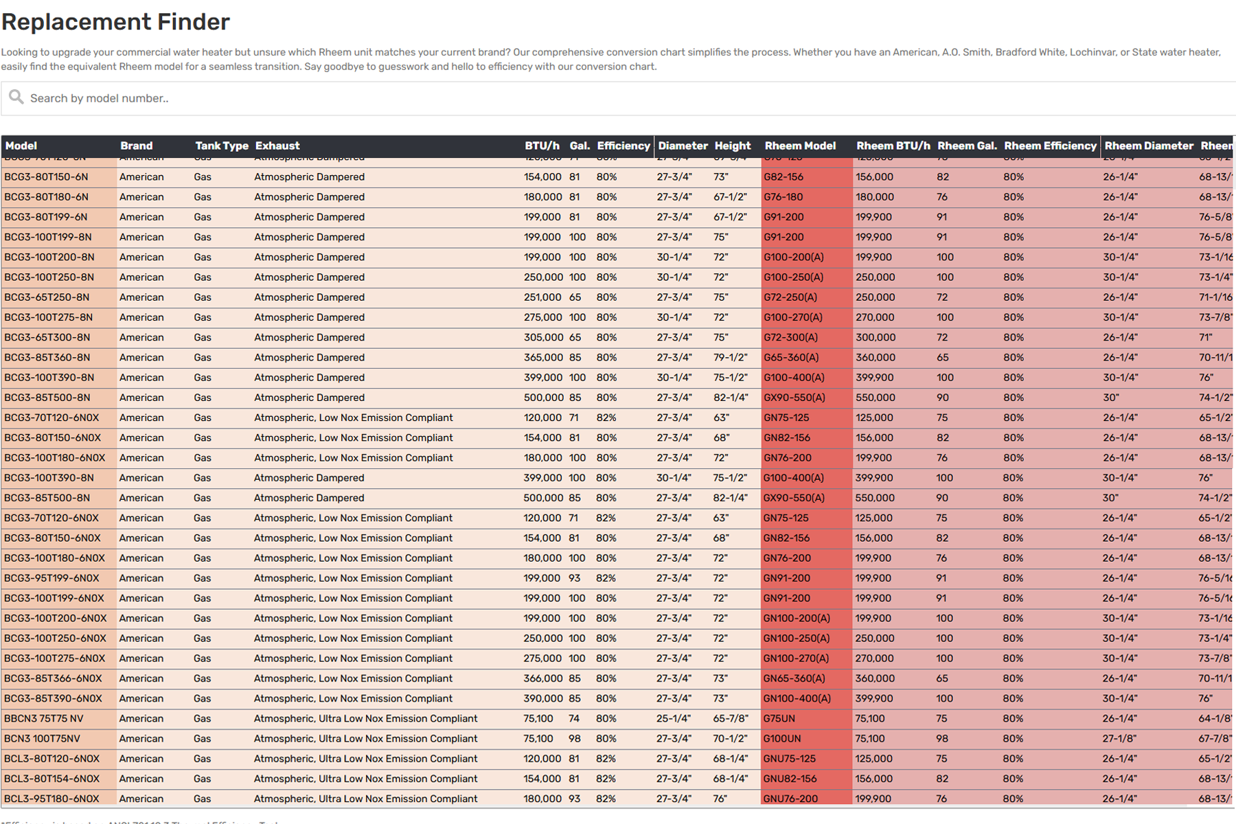 The Replacement Finder Tool is a quick, intuitive online resource that matches your current commercial water heater with a compatible replacement. By entering just the model number of your existing unit, you’ll instantly get options that meet your requirements—from Rheem.