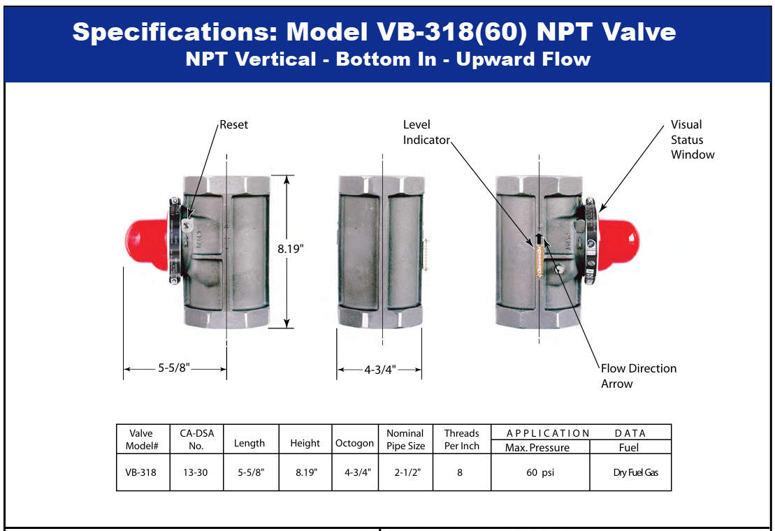 Válvula de cierre de gas para terremotos de entrada superior vertical de 1" 7PSI de la serie 301 de Pacific Seismic Products